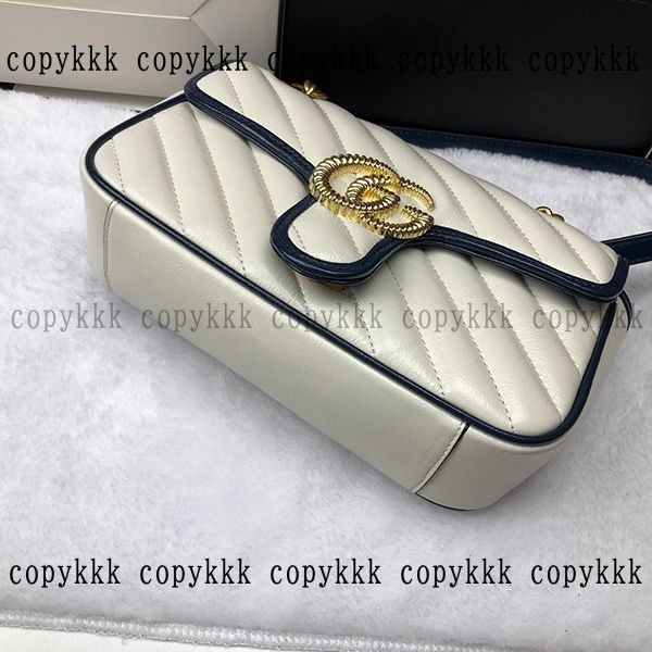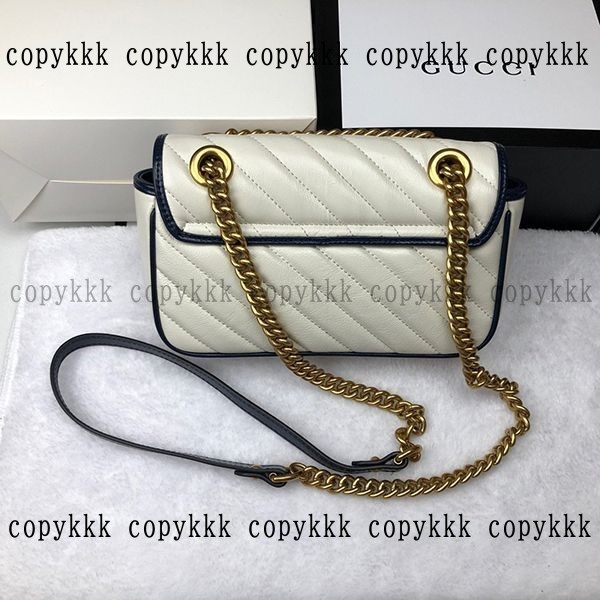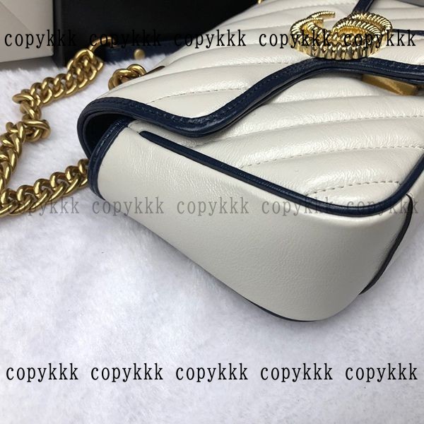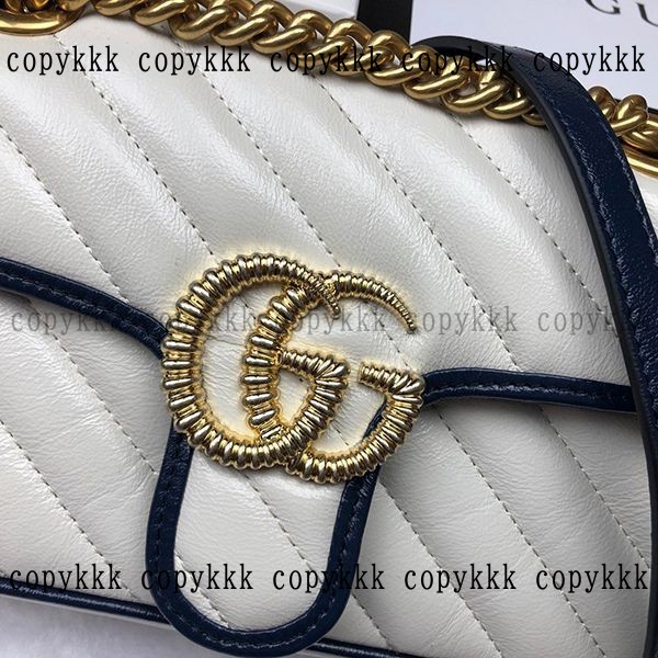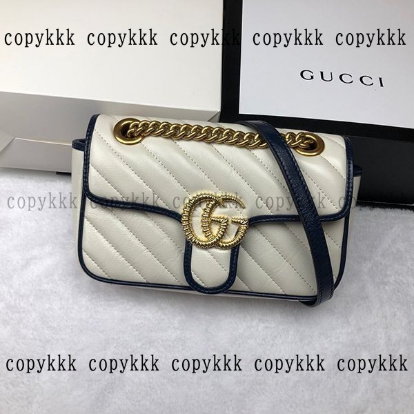 ホワイトベースにネイビーのパイピング、重厚なゴールドチェーンのグッチ 偽物GGマーモントショルダーバッグ。柔らかく上品なレザー素材に、ブランドのアイコニックな“GG”マークが輝き、洗練された大人のムードを醸し出します。